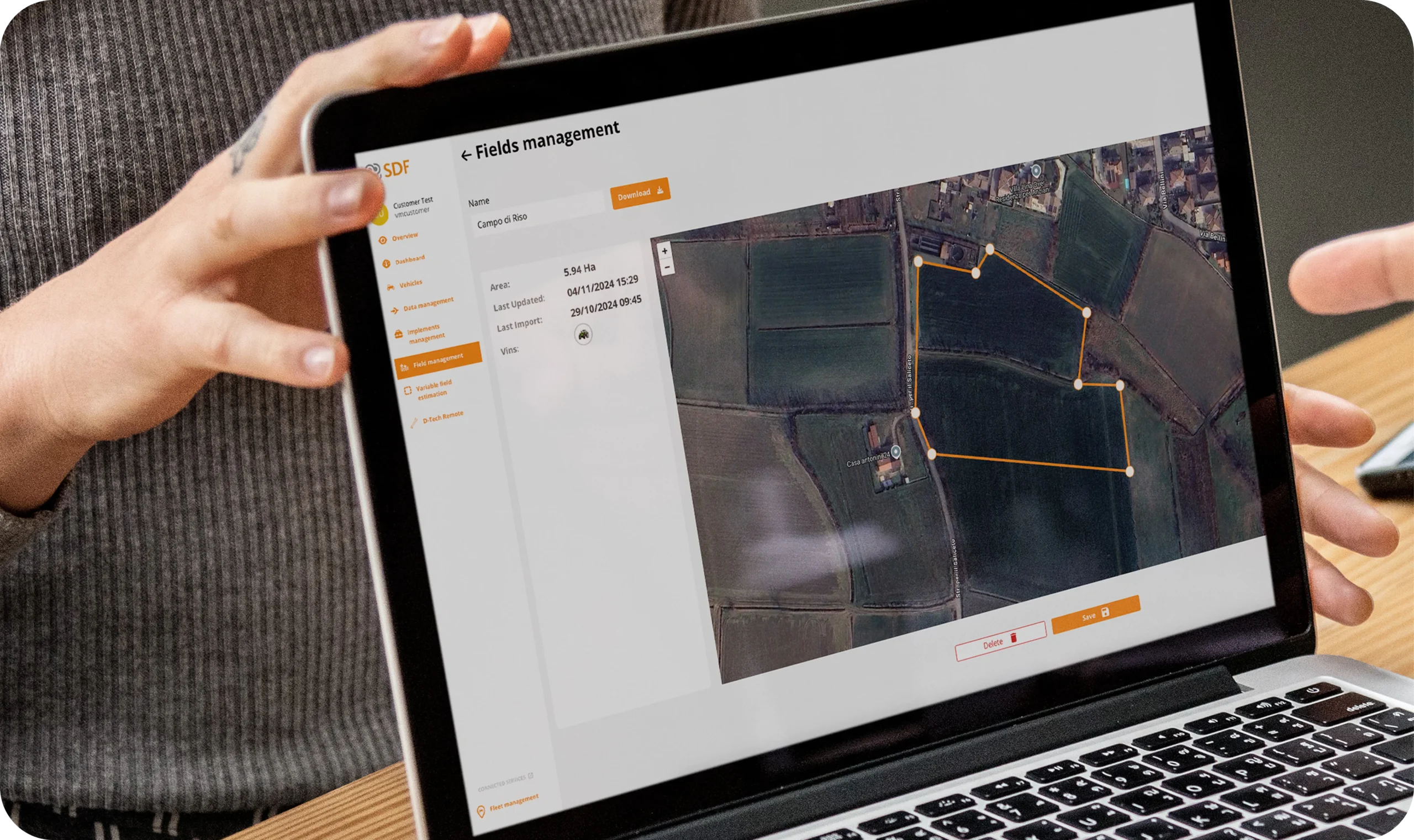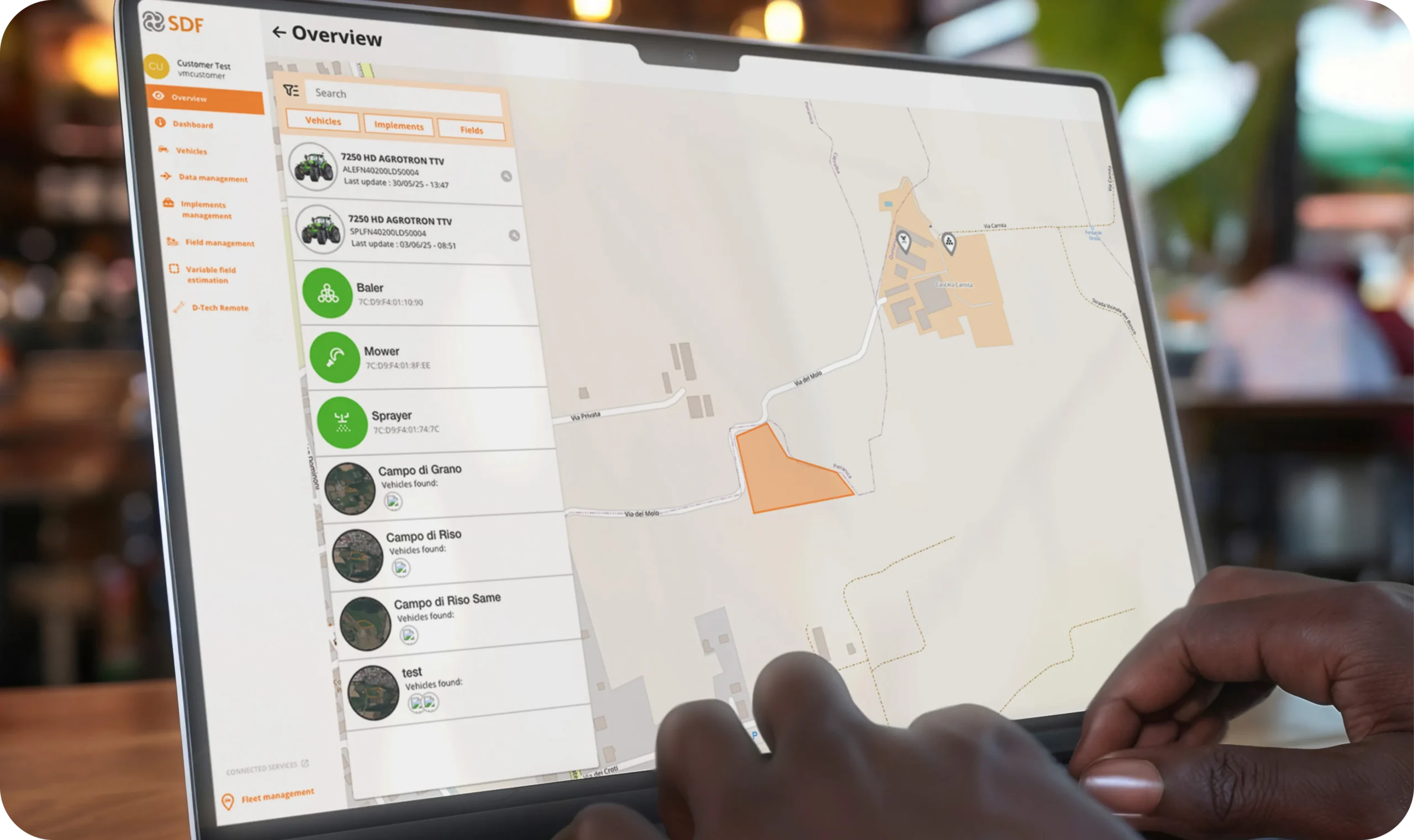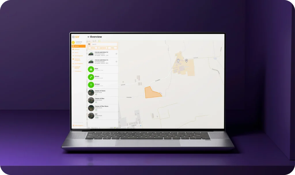 La gestione degli attrezzi agricoli è semplificata tramite un inventario digitale, e i clienti possono richiedere assistenza tecnica con i dati diagnostici necessari. Inoltre, il modulo di field management consente di gestire campi, colture e risorse agricole in modo ottimizzato.