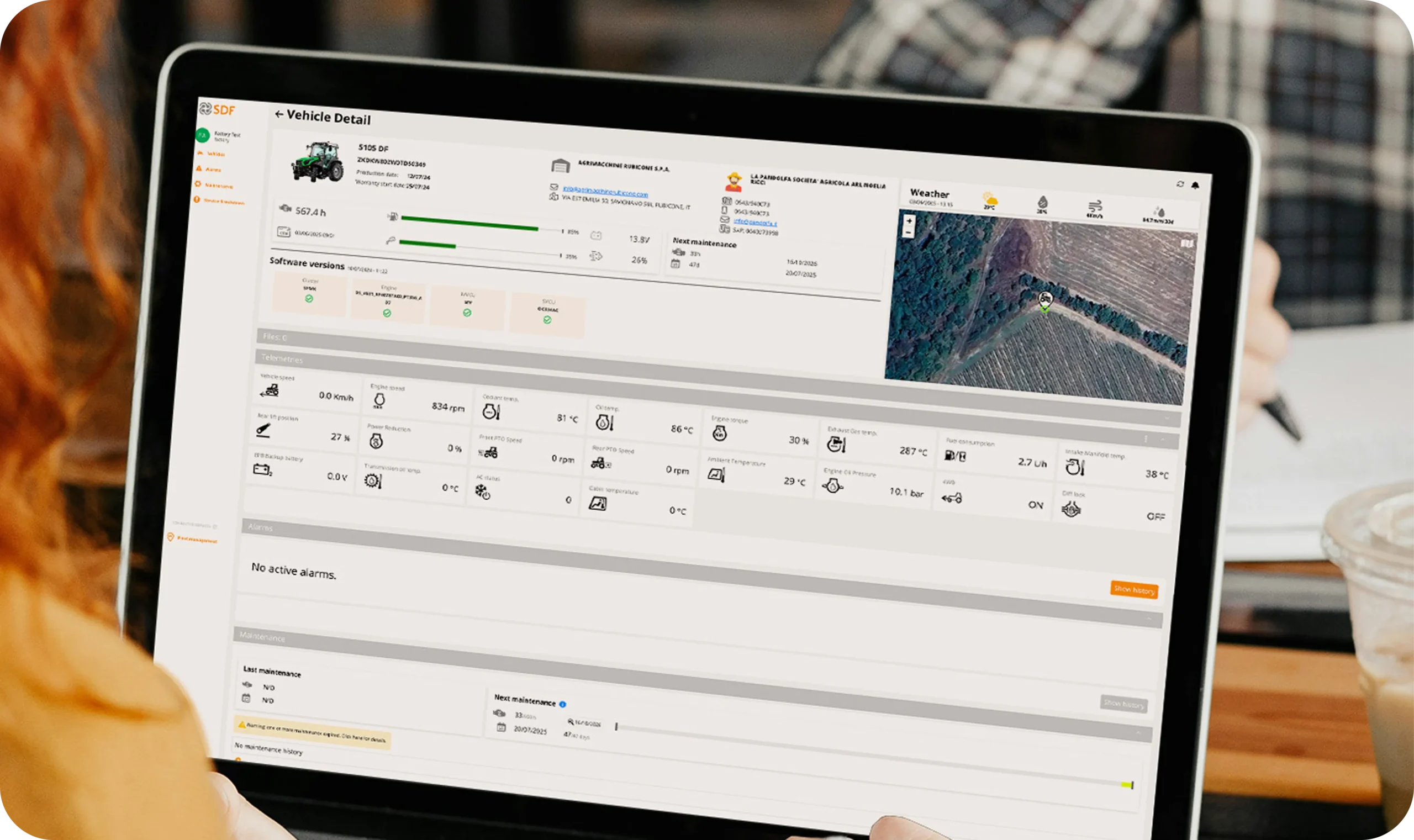 Il sistema ha due interfacce: una per i dealer SDF, che possono monitorare allarmi motore, manutenzione e parametri operativi, e una per i clienti finali, che possono monitorare i parametri dei trattori, come consumo carburante, ore di lavoro e posizione GPS, e inviare attività direttamente ai trattori.