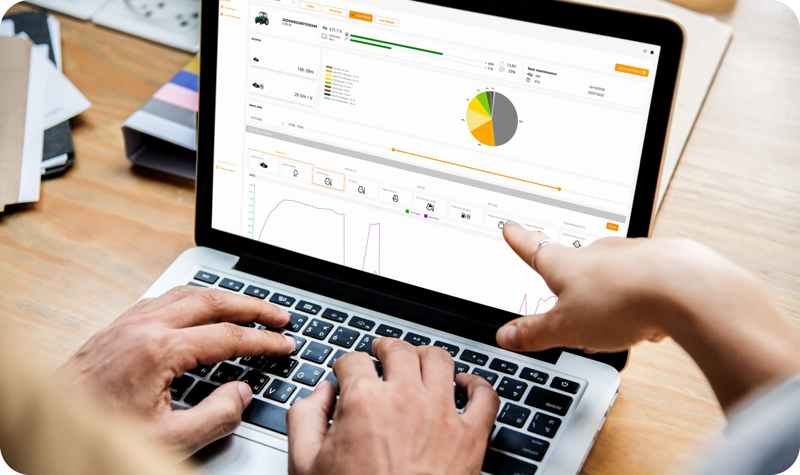 Il sistema fornisce un monitoraggio in tempo reale di tutti i parametri operativi critici del veicolo, inclusi velocità, giri motore, temperatura dei componenti, livello carburante e stato della batteria. La sezione telemetrica presenta una panoramica completa dello stato del macchinario con indicatori visivi intuitivi, gestione degli allarmi attivi e cronologia delle manutenzioni programmate, garantendo massima trasparenza operativa.